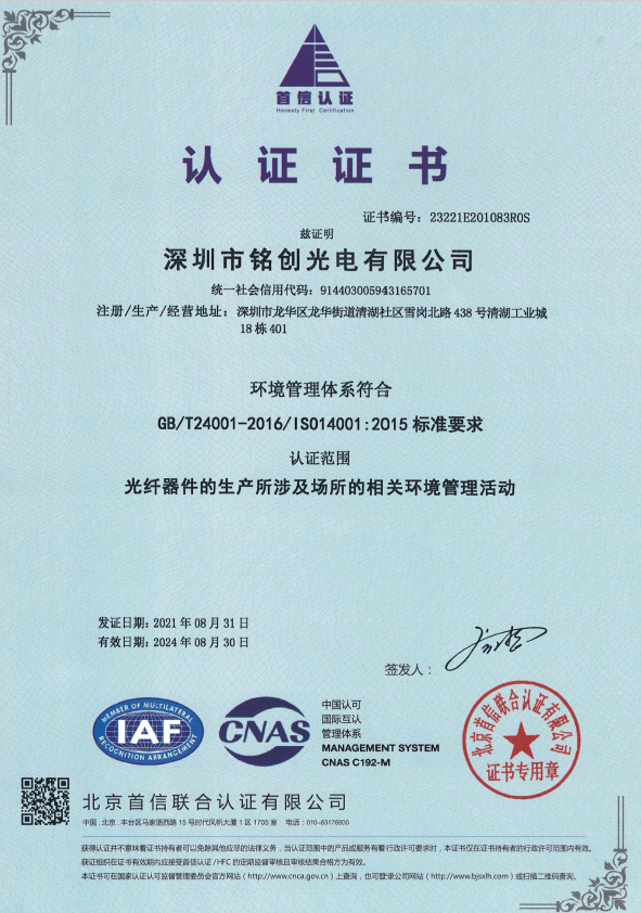 深圳市銘創光電有限公司于2012年成立,公司總部位于深圳市光明區,是一家國家級高新技術企業,通過了IS09001-2015質量管理體系認證和IS014001-2015環境管理體系認證;經過多年的持續研發投入和專注發展,銘創光電已逐漸成為光纖激光器、光纖傳感、激光雷達和激光通信等領域的綜合性產品服務商。 公司目前設立有光無源器件研發生產中心和激光研發生產中心。無源器件研發生產中心設有有高標準的無塵車間,可提供各種波長的無源光纖器件、高功率光纖器件、保偏光纖產品、超小型光纖器件。激光研發中心建立在安徽合肥市,研發生產特殊波長的激光光源、光纖激光器、光纖放大器以及新產品的技術研究儲備。研發生產中心與多地科研單位合作,能夠迅捷高效的為客戶提供相